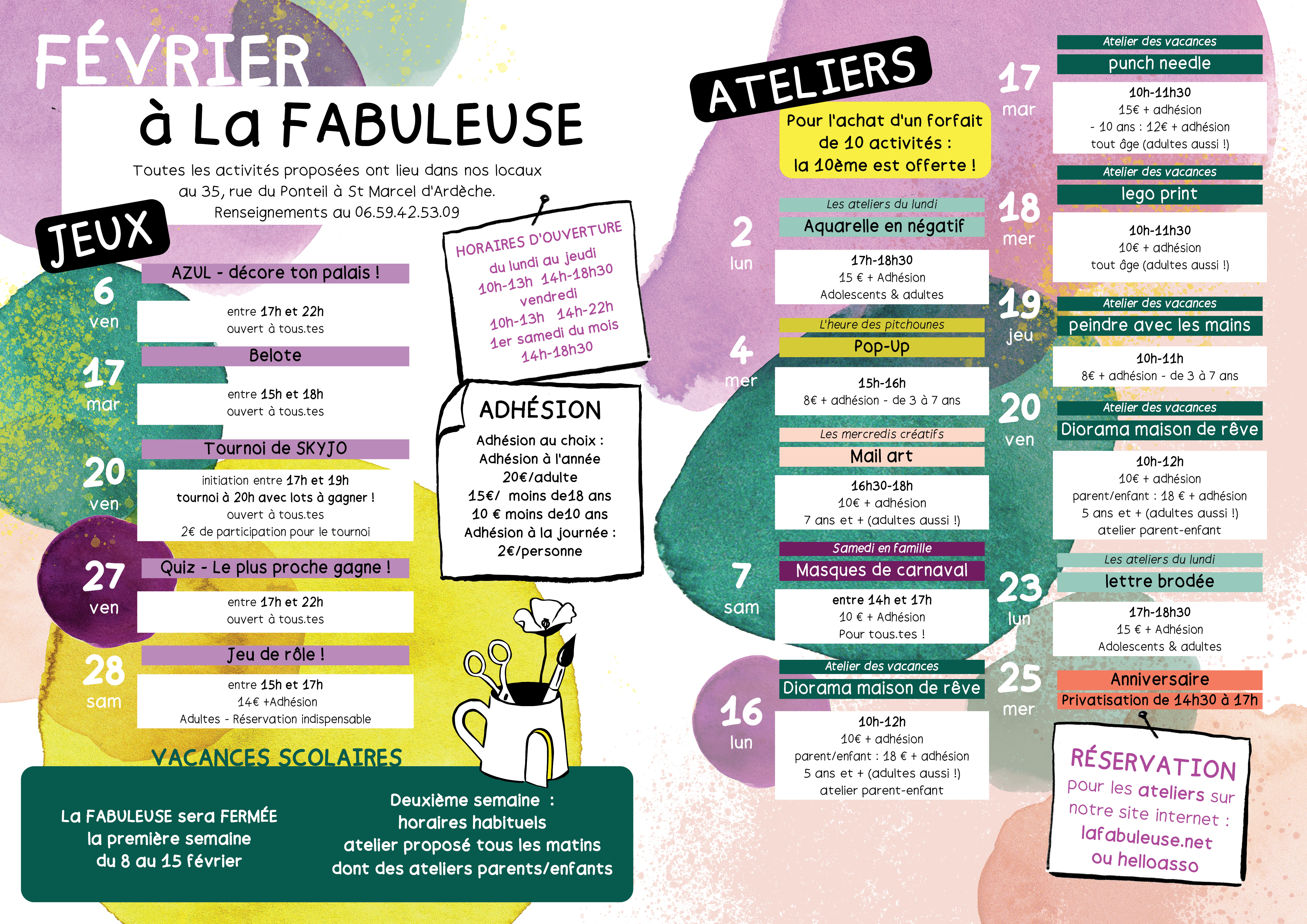 Ouverture de la semaine du 29 décembre 2025 au 03 janvier 2026 : Lundi/Mardi/Mercredi : 14h-18h30 Jeudi 01 janvier : Fermé Vendredi 02 janvier : 14h-22h (soirée jeux : initiation et tournoi de Skyjo)…